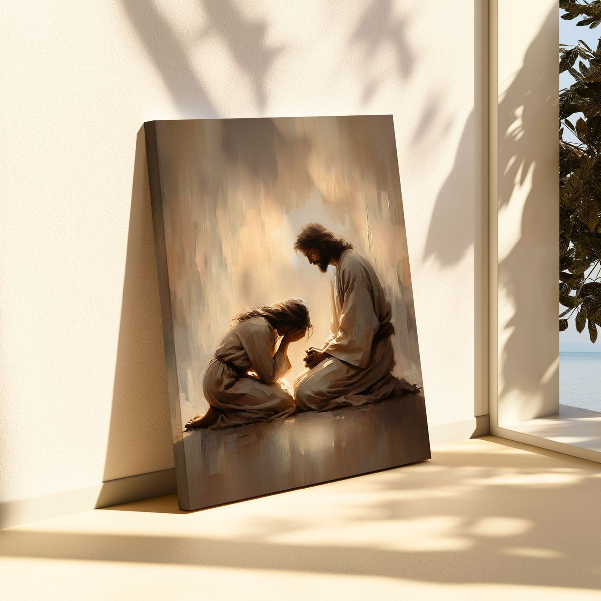 Create a space of solace with this moving canvas depicting Jesus comforting a crying woman. Its warm, gentle tones convey a message of profound grace and mercy in any room of your home.